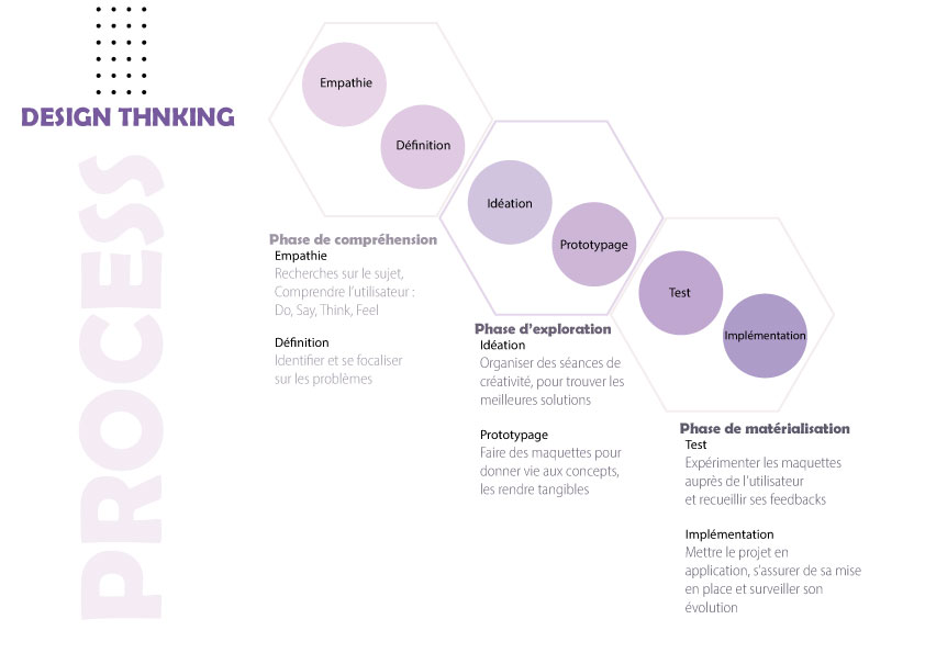 Le design thinking est souvent considéré comme un processus en plusieurs étapes, qui peut inclure l'empathie, la définition du problème, l'idéation, le prototypage et le test. Il est également flexible et itératif, permettant aux équipes de revenir en arrière et d'ajuster leur approche en fonction des commentaires et des résultats.